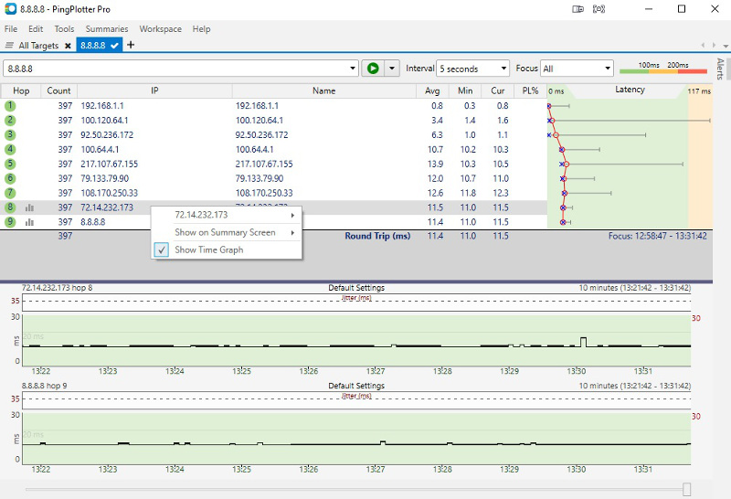 В нижней области окна программы будет выведен график полученного пинга и, по умолчанию, диаграмма задержек до целевого адреса IP. Графический отчет можно задать для каждого IP через выбор адреса и клик правой клавишей мыши. После этого откроется окно, где нужно выбрать команду Show TimeGraph.